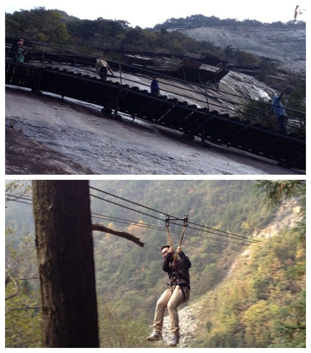 次日,在事業部總經理王悅生的帶領下,市場部、招商部人員挑戰自我、峽谷飛渡,體驗了全長600米的溜索;勇攀矗立在懸崖峭壁上的白馬峰棧道,登峰頂、鳴古鐘,奏響勝利的號角。