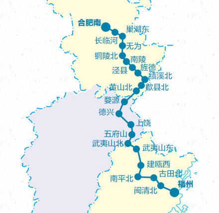 合福高鐵是京福高鐵的重要組成部分,全長806公里,是國內第四條設計時速350公里的雙線電氣化高速鐵路。作為溝通華中與華南地區的一條大能力客運,途經安徽、江西和福建三省,由于其線路貫穿武夷山、三清山、婺源、黃山多個著名旅游景區而被稱為國內顏值最高的最美高鐵。