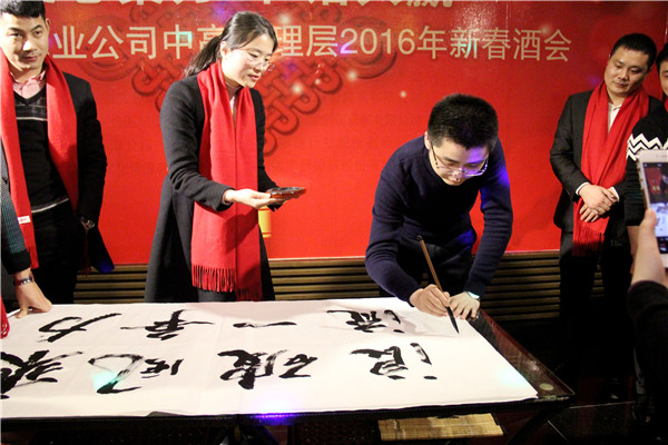酒會上,雷鳴董事長作了重要講話,向全體中高管理層成員拜年,感謝全體成員一年來為公司發(fā)展辛苦的付出與努力,并希望新的一年大家共同努力,讓公司繼續(xù)大展宏圖、欣欣向榮。之后,各分公司、事業(yè)部、部門紛紛以創(chuàng)新、幽默、多樣的方式向全體參會人員拜年。生產(chǎn)制造中心以喜慶的春聯(lián)為依托,在表達新春祝福的同時,還帶來了印有“安全第一 質(zhì)量為本”字樣的員工集體簽名橫幅,為確保產(chǎn)品質(zhì)量作出承諾;凈水家電事業(yè)部總經(jīng)理王悅生的現(xiàn)場即興題字,用丹青妙筆表達了其部門成員奮勇爭先的目標和信心;工程事業(yè)部總經(jīng)理劉東帶領(lǐng)其部門成員所采用的“三句半”拜年方式贏得了滿堂喝彩;財務(wù)部與企劃部共同合作的“異口同聲”有獎競猜創(chuàng)意拜年,更是傳達了“榮事達一家親”的美好寓意。