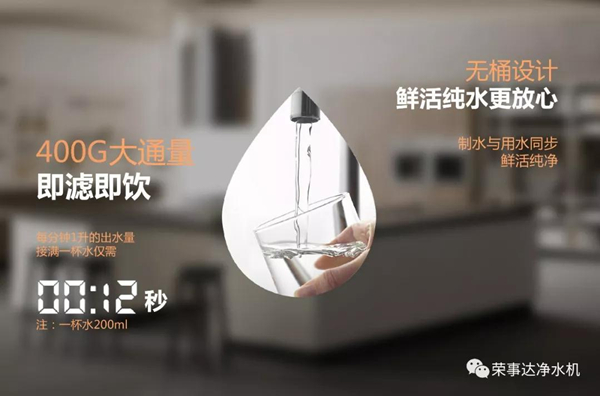 為提升用戶的“時效”體驗,榮事達400G智能反滲透凈水機從一開始產品定位就是400加侖出水速度,具體是什么概念呢?200ml一杯水,12秒就可以接滿,創新定制的400G大通量濾芯出水速度約為常規50G凈水機的8倍,隨時飲水無需等待,為生活留下更多時間欣賞窗外美景。
