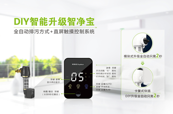 值得一提的是,為進一步方便用戶使用,提升產品體驗,榮事達為第五代、第六代智能前置過濾器分別打造兩款定制化新品,量身融入智凈寶自動排污模塊,2秒即可直接加裝升級。專屬定制的DIY智凈寶配備了直屏觸控排污系統,輕觸即可任意設置排污時間和排污天數,實現完全自主排污;獨特排污閥閉合自檢能力,徹底排除漏水風險,方便省心,使用無憂。