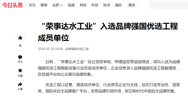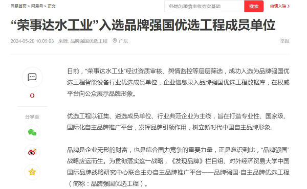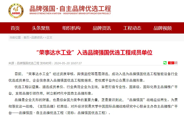 • 5月20日,發現品牌官網、品牌強國優選工程官網、網易、今日頭條發表了“‘榮事達水工業’入選品牌強國優選工程成員單位”的文章,文中肯定了榮事達水工業以創新為驅動,以綠色制造為己任,不僅深耕國內市場,更在國際舞臺上展現中國制造的魅力的大作為、強擔當。
