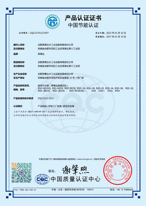 榮事達(dá)RSD-RO4E節(jié)能直飲機(jī)是中國節(jié)能認(rèn)證產(chǎn)品,產(chǎn)品采用節(jié)能熱交換技術(shù),在管式交換器內(nèi),過濾后的自來水吸收開水釋放的熱能升溫85℃左右,從而充分節(jié)省了降水燒開所需的電能和時間,有效改善了傳統(tǒng)飲水機(jī)的費(fèi)時、費(fèi)電的弱點(diǎn)。設(shè)備采用二開水二溫水設(shè)計,既滿足了員工泡茶的需求,也提供了即飲的溫水選項(xiàng),極大地方便了員工的日常飲水。此外,設(shè)備采用先進(jìn)的RO反滲透技術(shù),有效濾除水中的泥沙、鐵銹、重金屬等雜質(zhì),出水可達(dá)直飲標(biāo)準(zhǔn)。