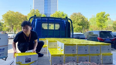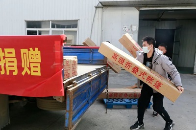 4月8日榮事達(dá)水工業(yè)集團(tuán)工作人員以最快的速度進(jìn)行物資的裝載,滿載著抗疫物資,發(fā)往37℃的愛活動統(tǒng)籌處。