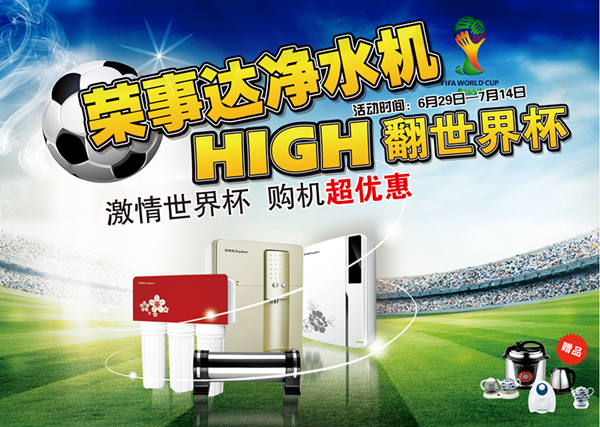 榮事達始終踐行“紅地毯服務”的服務理念,致力于讓每一名中國人都能喝上安全放心水。由于世界杯期間,氣溫漸高,人的身體中水分的流失速度逐漸加快。要熬夜看球,必須要補充大量的水分。為了保證廣大球迷能夠看好球、喝好水,榮事達凈水機決定開展“High翻世界杯”活動。活動期間,“凈水行業領導者”——榮事達凈水機在全國各大銷售網點將開展一系列“High翻世界杯”活動,旨在引領一場世界杯期間的凈水風潮。